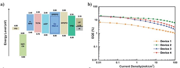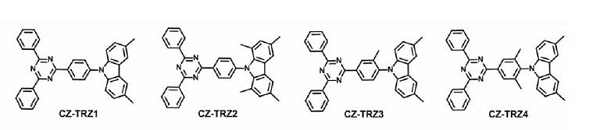 architecture has been developed. The electronic interaction between donor and acceptor plays a key role in the TADF mechanism. TADF OLEDs based on Cz-TRZ3 and Cz-TRZ4 exhibited high maximum EQEs of 19.2 and 18.3% and CIE coordinates of (0.148, 0.098) and (0.150, 0.097), respectively.